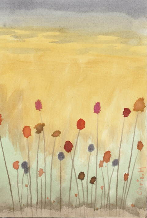 Friche : 10 x 15 cm, aquarelle végétale avec des pigments extraits de chou rouge, garance, micocoulier, millepertuis, oignon blanc, oignon rouge et raisin d’Amérique. [Série de 4 dessins]
