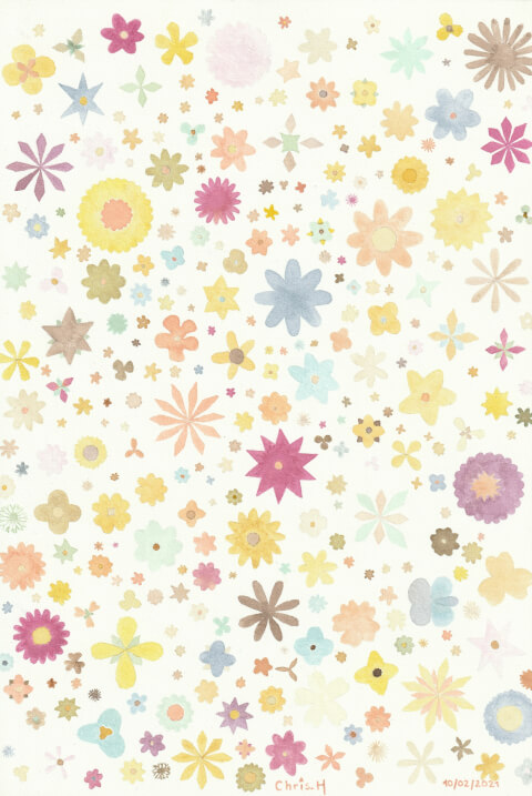 300 Fl. : 20 x 30 cm, aquarelle végétale avec des pigments extraits d’ailante, amarante rouge, armoise commune, aulne glutineux, avocat, bouleau verruqueux, café, carotte, chou rouge, cosmos sulfureux, eucalyptus, eupatoire, frêne, garance, haricot noir, mahonia, micocoulier, millepertuis, mûrier, myrtille, oignon blanc et oignon rouge, oseille de Guinée, oseilles sauvages, raisin d'Amérique, reine des prés, renouée des teinturiers, roucou, tanaisie, verge d'or, vergerette du Canada, vigne & des additifs : jus de citron, vinaigre blanc, sel de mer, savon de Marseille, bicarbonate de sodium, ammoniaque, soude, sulfate de cuivre, acétate de fer (soupe de clou). Ces 300 fleurs ont été peintes avec 51 encres végétales différentes, fabriquées avec les pigments extraits de 32 plantes et divers additifs classiques en teinture végétale.