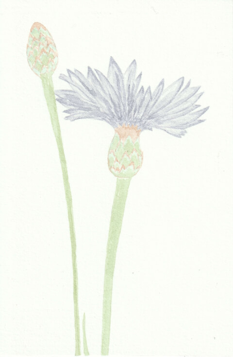 Bleuet (coll. mini-fleurs) : 10 x 15 cm, aquarelle végétale avec des pigments extraits d’armoise commune, chou rouge, garance et micocoulier.