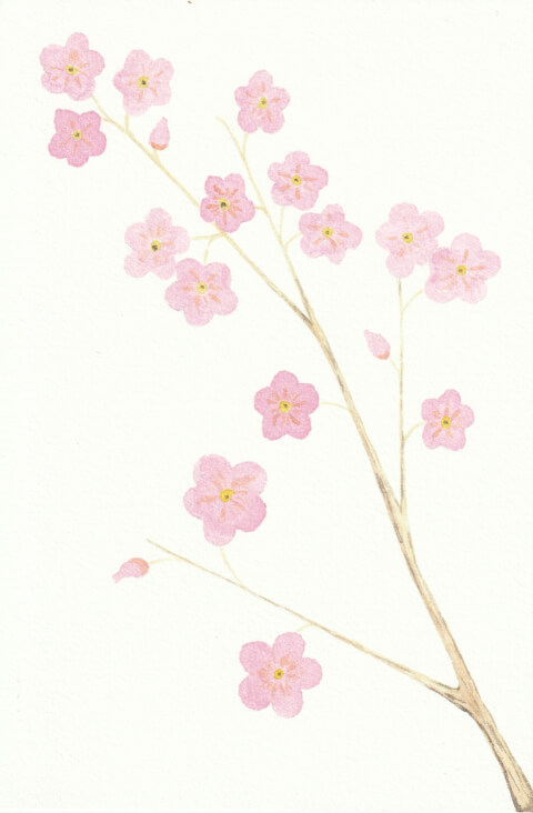 Cerisier (coll. mini-fleurs) : 10 x 15 cm, aquarelle végétale avec des pigments extraits d’ailante, betterave, café, frêne, garance et verge d’or.