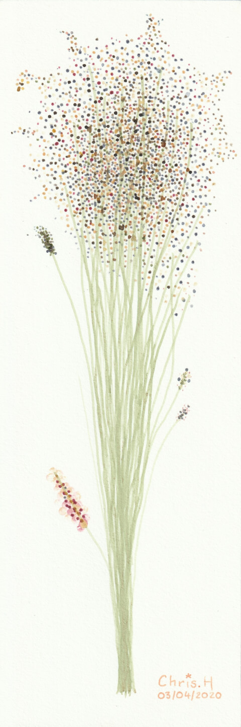 Composition florale : 10 x 30 cm, aquarelle végétale avec des pigments extraits d’ailante, avocat, café, chou rouge, cosmos sulfureux, eucalyptus, mahonia, micocoulier, mûrier, oignon blanc et oignon rouge, oseille de Guinée, raisin d’Amérique, renouée des teinturiers, roucou, tanaisie et vigne.