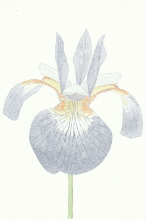 Iris de Sibérie (coll. mini-fleurs) : 10 x 15 cm, aquarelle végétale avec des pigments extraits de carotte, chou rouge, garance et micocoulier.