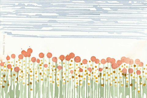 Koulurs (paysage, verticales ou croisées) : 20 x 30 cm, aquarelle végétale avec des pigments extraits de chou rouge, garance, micocoulier et verge d’or.
