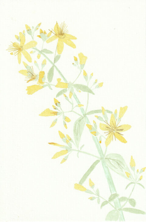 Millepertuis (coll. mini-fleurs) : 10 x 15 cm, aquarelle végétale avec des pigments extraits d’armoise commune, micocoulier et verge d’or.