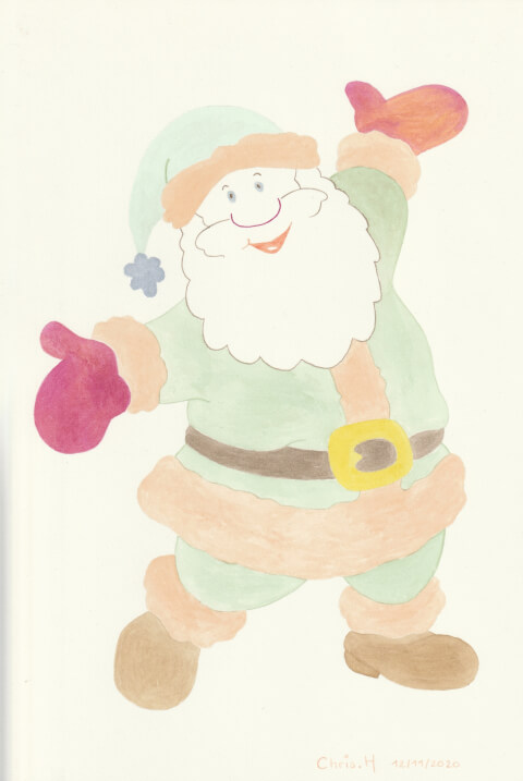 Père Noël vert : 20 x 30 cm, aquarelle végétale avec des pigments extraits d’ailante, armoise commune, café, chou rouge, garance, micocoulier, oignon blanc, raisin d’Amérique et verge d’or.
