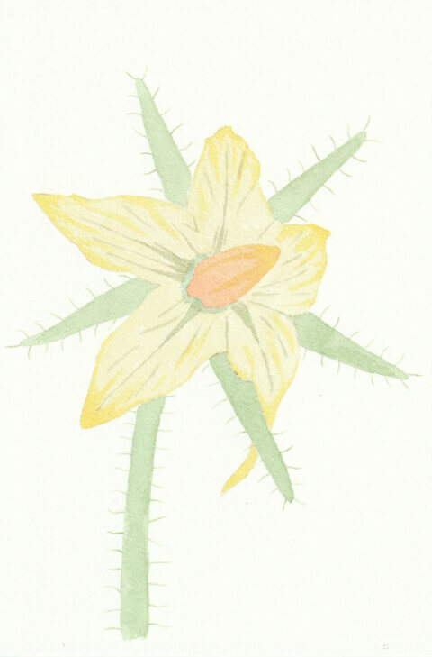 Tomate (coll. mini-fleurs) : 10 x 15 cm, aquarelle végétale avec des pigments extraits d’armoise commune, carotte, garance, micocoulier et verge d’or.