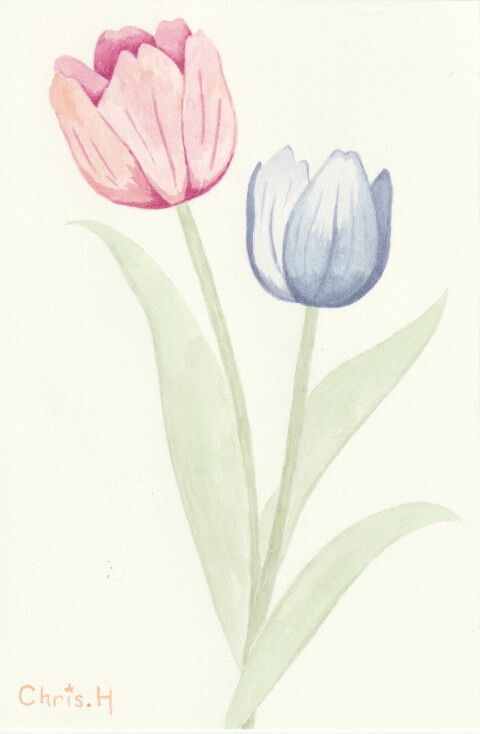 Tulipes : 10 x 15 cm, aquarelle végétale avec des pigments extraits de chou rouge, micocoulier et raisin d’Amérique.