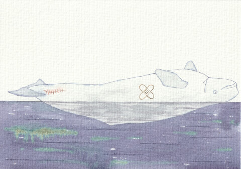 Bélugaga et drôles de poissons : hippolicorcampe, gros poisson rouge et petits poissons verts, exocet et hippocampe (coll. zanimos ; plusieurs motifs différents - CP) : carte postale 10,5 x 14,8 cm, aquarelle végétale avec des pigments extraits d’ailante, armoise commune, chou rouge, garance, micocoulier, oignon blanc et verge d’or.