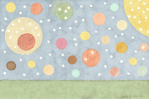 Bubulles : 20 x 30 cm, aquarelle végétale avec des pigments extraits d’ailante, armoise commune, avocat, bouleau, café, chou rouge, cosmos sulfureux, garance, micocoulier, oignon blanc et oignon rouge, raisin d’Amérique, tournesol et verge d’or.