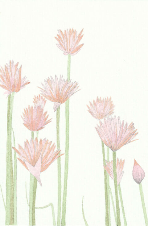Ciboulette (coll. mini-fleurs) : 10 x 15 cm, aquarelle végétale avec des pigments extraits de betterave, chou rouge, garance et micocoulier.