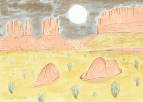Désert (grand) : 20 x 30 cm, aquarelle végétale avec des pigments extraits d’ailante, armoise commune, chou rouge, garance, micocoulier et verge d’or. Également disponible en format 10 x 15 cm à 20 €.