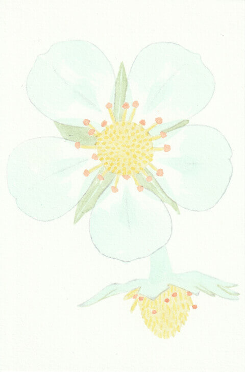 Fraisier (coll. mini-fleurs) : 10 x 15 cm, aquarelle végétale avec des pigments extraits d’armoise commune, carotte, chou rouge, garance, micocoulier et verge d’or.