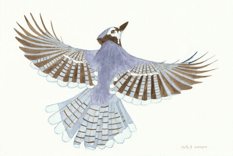 Geai moqueur : 20 x 30 cm, aquarelle végétale avec des pigments extraits d’ailante et chou rouge.