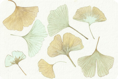 Ginkgo biloba (coll. feuilles mortes ; plusieurs motifs différents - CP) : carte postale 10,5 x 14,8 cm, aquarelle végétale avec des pigments extraits d’ailante, armoise commune, micocoulier et millepertuis (GIN5) ou verge d’or (GIN1 à 4). L’aquarelle GIN5 a été peinte avec des plantes tinctoriales, sauvages et spontanées, toutes récoltées dans le jardin partagé l’Oasis de Gerland. Le Ginkgo ou arbre aux quarante écus a des feuilles uniques, formées de deux lobes en forme de palme et sans nervure centrale. D’abord vert pâle, elles deviennent jaune vif en automne.