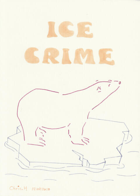 Ice Crime : 15 x 20 cm, aquarelle végétale avec des pigments extraits de chou rouge, oignon blanc et raisin d’Amérique. [Également disponible en format 10 x 15 cm]