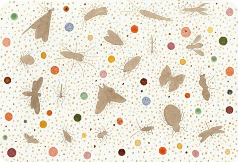 Minuscules : Melting pote, Fourmiz, Koléox, Moches et sticmous, Papilyons et Zarainiées (coll. minuscule - CP) : carte postale 10,5 x 14,8 cm, aquarelle végétale avec des pigments extraits d’ailante, armoise commune, avocat, betterave, bouleau, café, chou rouge, eucalyptus, garance, micocoulier, millepertuis, oignon blanc et oignon rouge, raisin d’Amérique, tournesol et verge d’or.