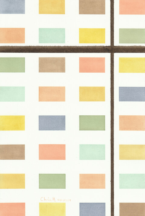 Mosaïque (2 motifs différents) : 20 x 30 cm, aquarelle végétale avec des pigments extraits d’ailante, armoise commune, bouleau, chou rouge, garance, micocoulier, oignon blanc, oignon rouge et verge d’or.