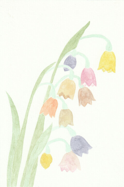 Muguet (coll. mini-fleurs) : 10 x 15 cm, aquarelle végétale avec des pigments extraits d’armoise commune, betterave, café, carotte, chou rouge, frêne, garance, micocoulier, oignon blanc et verge d’or.