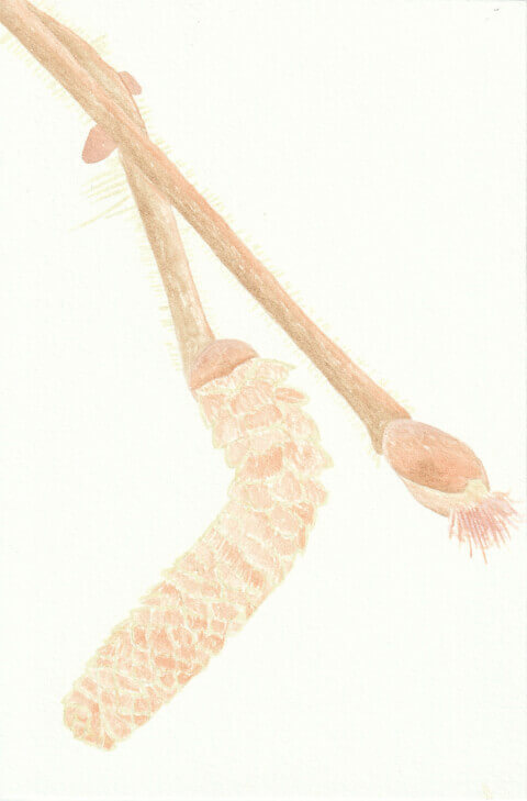 Noisetier (coll. mini-fleurs) : 10 x 15 cm, aquarelle végétale avec des pigments extraits d’avocat, betterave, café, carotte et garance.