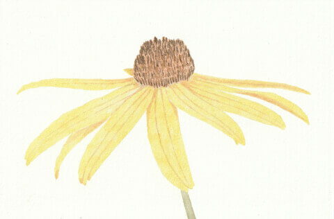 Rudbeckia (coll. mini-fleurs) : 10 x 15 cm, aquarelle végétale avec des pigments extraits d’ailante, armoise commune, café, garance, micocoulier, oignon blanc et verge d’or.