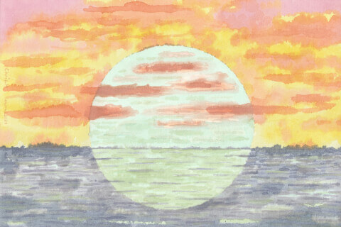 Soleil vert (grand) : 20 x 30 cm, aquarelle végétale avec des pigments extraits d’armoise commune, betterave, bouleau, carotte, chou rouge, garance, micocoulier et verge d’or.